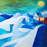 Een geometrisch landschap met besneeuwde toppen onder een sterrenhemel en een oplichtende maan. Een eenvoudig huis op de achtergrond voegt warmte toe aan het ijzige landschap.