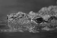 De Krokodil komt aangezwommen met de ogen net boven het water. Het oog weerspiegelt in het water. Het is een imposant beest.