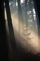 In het spotlicht. Een kleine den wordt subtiel verlicht door een verdwaalde zonnestraal. Terwijl de rest van het bos in het donker staat, heeft deze boom het licht gevonden.