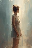 Een jonge vrouw staat in de zachte gloed van het licht, omringd door zachte, schilderachtige penseelstreken. De sfeer is kalm, dromerig en vol stilte. Een poëtisch beeld vol innerlijkheid.
