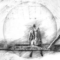 Digitale tekening van een naakte vrouw zittend in haar eigen bubbel.