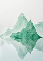 Een abstract geïllustreerde poster van een boot op kalm water nabij enkele bergtoppen. Alles is in groen.