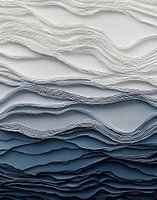 Golvende lijnen die van boven naar beneden in toon verlopen van wit naar diepblauw. De vormen doen denken aan papier dat zorgvuldig is uitgesneden en op elkaar gelegd, waardoor er een tastbare, sculpturale textuur ontstaat. De vloeiende contouren roepen onmiddellijk associaties op met landschappen, waterstromen of luchtlagen – zonder concreet figuratief te worden.
