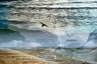 Combinatie van drie foto's. Als basis een foto van het wad met een heleboel meeuwen op de achtergrond en eentje op de voorgrond. Daar doorheen een bewerkte foto ook van het wad met een vliegende scholekster. Op de derde foto een jongetje dat zijn ogen gesloten heeft en misschien wel net als ikzelf droomt dat hij kan vliegen.