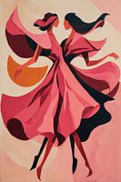 Een betoverend duo in volle dans, gevangen in een explosie van roze, koraal en zwarte tinten. Deze illustratie ademt beweging en vrijheid uit met verfijnd geanimeerde figuren wier vliedende gewaden het ritme van een timeless performance markeren. De gelaagde kleurenpalette en moderne kunstenaarshand creëren een sfeer van verfijnde…