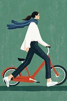 Een stijlvolle illustratie van een moderne stedelijke fietser in minimalistische stijl tegen een groene achtergrond. De figuur draagt een witte oversized trui, donkere jeans en witte sneakers, terwijl een blauwe sjaal dynamisch in de wind wappert. De rode fiets vormt een krachtig kleuraccent in de compositie, wat de moderne en duurzame…