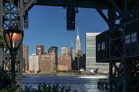 Oude kraan in Long Island met uitzicht op Midtown Manhattan over de East River