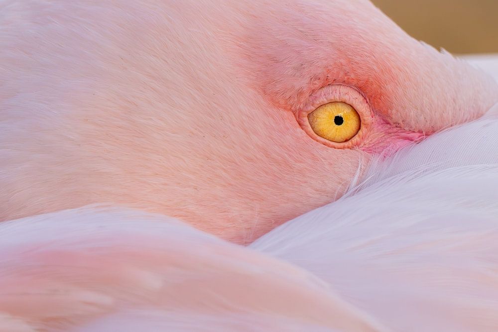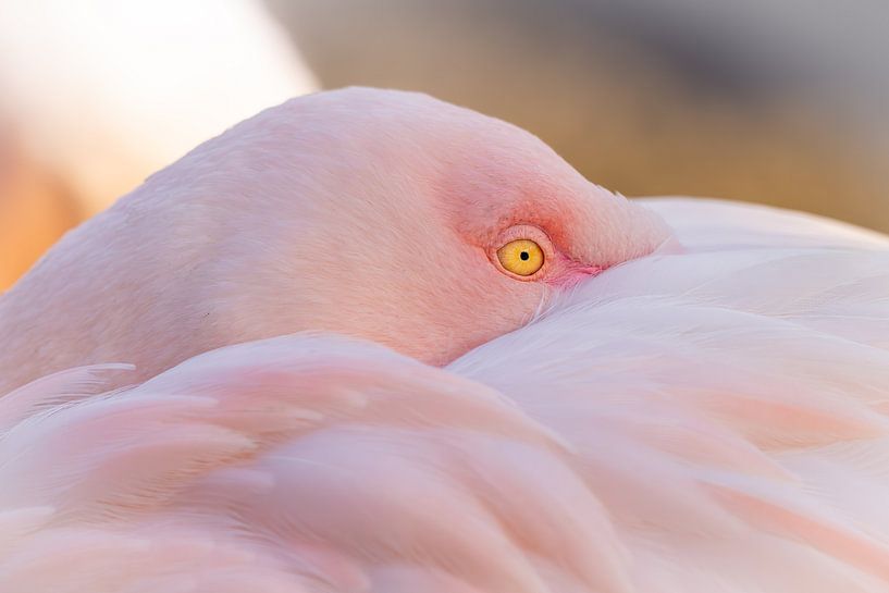 In een zee van zachtroze veren rust een flamingo ogenschijnlijk vredig. De houding is kalm, het lichaam ontspannen, alsof de wereld even heeft stilgestaan. Maar dan is daar dat ene detail: het oog. Helder, goudgeel en wakker. Een blik die verraadt dat de stilte misschien minder onschuldig is dan ze lijkt.