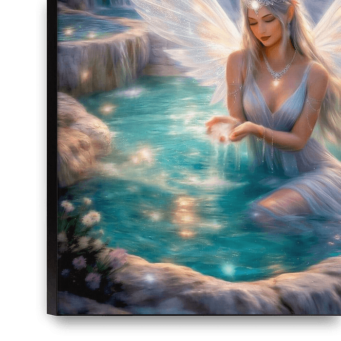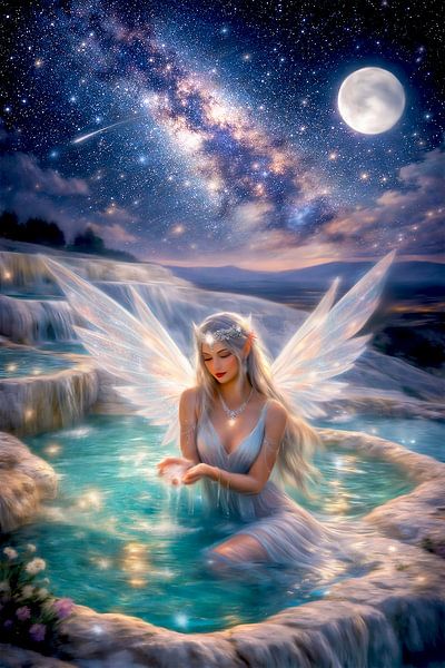 In dit handgemaakte kunstwerk zit een liefdevolle deva in een natuurbad onder een fonkelende sterrenhemel. De maan en een vallende ster verlichten het tafereel en brengen een sfeer van magie, stilte en verlangen. Het kristalheldere aquablauwe water glijdt zacht door haar handen en weerspiegelt haar innerlijke rust en…
