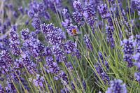 Een bij in actie, midden tussen de lavendelstengels vol bloei.