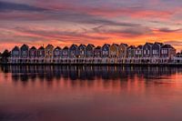 Een prachtige zonsondergang aan de Rietplas in Houten. De lucht staat in vuur en vlam bij de gekleurde zogenaamde Regenbooghuizen en laat een mooi roodachtig schijnsel achter in het water.