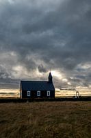 Het zwarte kerkje in IJsland bij zonsopgang, waarbij je het contrast voelt van de warmte van de zon en het onstuimige weer.
