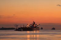 Binnenkomende supertanker tijdens zonsondergang op de Maasvlakte in de haven van Rotterdam.
