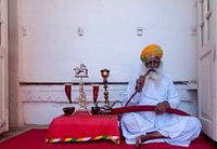 Koop de foto India: Man met waterpijp in Fort Mehrangarh (Jodhpur) van Maarten Verhees op canvas, aluminium dibond, (ingelijste) fotoprint, behang en ArtFrame, op maat geprint in Fine-Art kwaliteit.