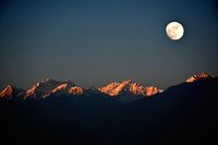adembenemende zonsondergang boven de Himalaya, met de maan als toeschouwer