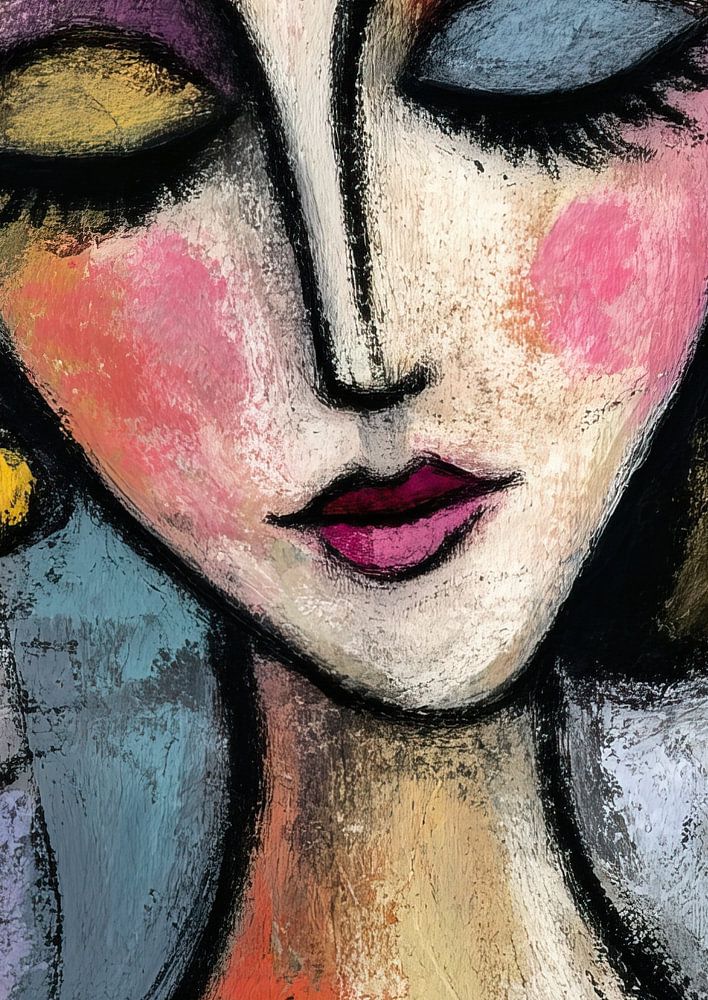 India - In dit vrouwen schilderij zie je een vrouw met een strak gezicht, opvallende make-up en een grote oorbel, omringd door heldere kleuren en abstracte vormen.
