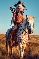 Een majestueuze krijger zit trots op zijn versierde witte paard, dat schittert in het gouden licht van de ondergaande zon. De prachtige veren hoofdtooi en de versierde lichaamsschilderingen stralen kracht en culturele diepgang uit. De brede horizon en het zachte gras benadrukken de verbinding met de natuur en de geesten uit het verleden.