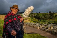 Deze indiaanse vrouw spint wol bij zonsondergang in Ingapirca. Dit is een beroemde archeologische vindplaats van de Maan tempels van de Ingapirca Indianen en de Zonnetempel van de Inca's welke de Ingapirca indianen verdreven
