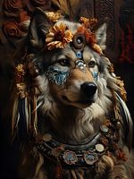 Het foto portret toont een majestueuze vrouwtjes wolf. Ze draagt een prachtige indian look veren en bloemen tooi op haar kop wat haar uitstraling versterkt en een spirituele verbinding suggereert. De bloemen geven een subtiele en zachte touch aan haar trotse voorkomen. Het portret vangt de essentie van de wilde natuur en de krachtige…