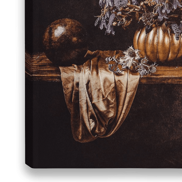 Indian summer is een bloemstilleven met bloemen vers van het land geplukt begin september.het goud geeft je een warm en zomers gevoel. de zandloper geeft aan dat de tijd door tikt en ook het zomerse gevoel zal weer verdwijnen ook als je die nog zo lang mogelijk wil blijven vasthouden.