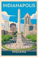 Een levendige afbeelding van Indianapolis, waar de majestueuze Monument Circle op de voorgrond staat en wordt omringd door moderne gebouwen. De harmonieuze kleuren en gestileerde lucht geven het kunstwerk een vrolijke sfeer. Ideaal voor de woonkamer om een vleugje stedelijke elegantie en culturele flair vast te leggen.