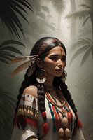 Digitaal portret van een vrouw gekleed in Indiaanse/Azteekse klederdracht. Op de achtergrond het Amazone regenwoud.