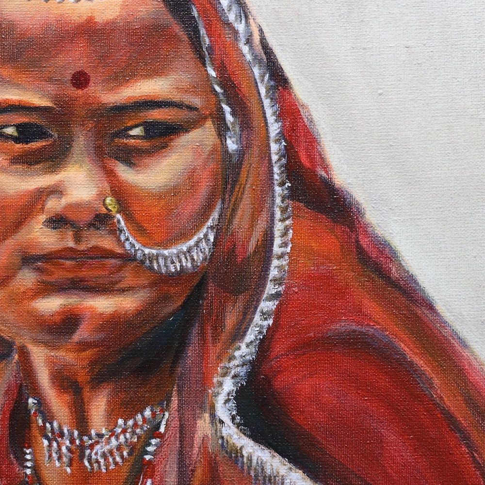 Een Indiase vrouw, gehuld in een sari van roodtinten, in een moment van overpeinzing en sereniteit, waarin haar aanwezigheid zowel kracht als tederheid uitstraalt.