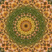 Een kaleidoscopisch werk, je zou het ook een mandala kunnen noemen, gebaseerd op de bloemen van een albizia-boom. Ik heb twaalf transparante kopieën van die foto digitaal over elkaar gelegd, geroteerd in stapjes van dertig graden. En dit was het resultaat: een spel van lijnen en kleuren waarin je steeds weer nieuwe patronen…