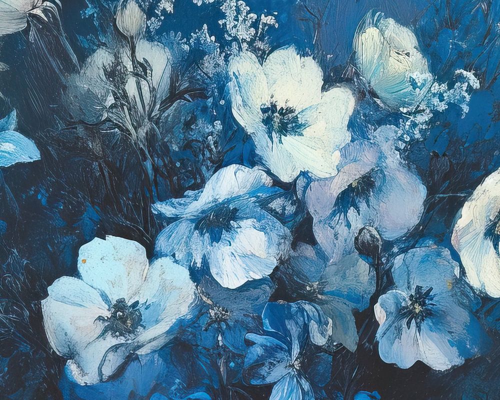 Indigo Bloemen - Met een diepe, indigoblauwe achtergrond, biedt dit schilderij een klassieke bloemencompositie met een moderne twist. De textuur en het gebruik van licht brengen de witte bloemen, die lijken op anemonen, tot leven, wat een contrast en diepte creëert die zowel dramatisch als verfijnd is.
