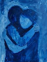 Dit rustgevende, intieme kunstwerk toont een intieme omhelzing tussen twee figuren, uitgebeeld in verschillende nuances van diepblauw en indigo.