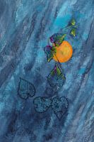 Indigo Leaves in the Moonlight is een portretformaat schilderij waarin de kunstenaar Karen Kaspar aquarelverf en acrylverf heeft gecombineerd. Hartvormige bladeren in donker indigoblauw ranken naar de donkere nachtelijke hemel. De gouden volle maan schijnt helder aan de donkere hemel en baadt de bladeren in een betoverend licht.