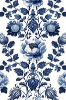 De afbeelding is rijkelijk gevuld met diverse soorten bloemen en bladeren, allemaal uitgevoerd in verschillende tonen indigoblauw, wat een rustgevende en tegelijkertijd elegante sfeer creëert. Het patroon is symmetrisch en…