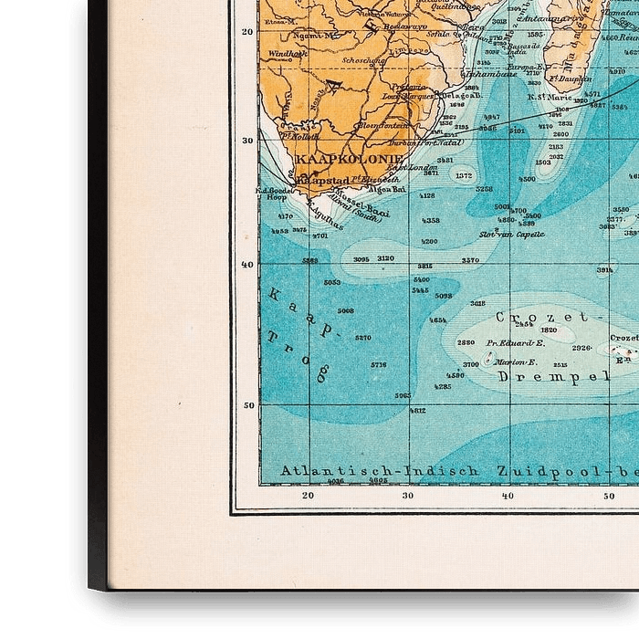Op deze antieke kaart uit ca. 1900 staat de Indische Oceaan afgebeeld. Er is een legenda met hoogte en dieptegordels opgenomen. De kaart is in kleur.