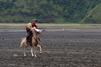 Indonesë: Bromo vulkaan, man op paard op een lava ondergrond.