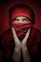 Indringende Foto van Vrouw in Rode Sluier - Krachtige Blik met Groene Ogen van Elianne van Turennout