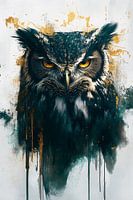 Dit kunstwerk toont een indrukwekkende uil met een intense, vastberaden blik. Met zijn contrasterende kleuren en subtiele gouden accenten straalt het ontwerp kracht en mysterie uit. De expressieve penseelstreken en diepe texturen brengen een levendige energie in het werk, waardoor het lijkt alsof de uil direct naar je kijkt, alert en…