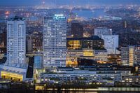 De foto laat het Erasmus MC zien vanaf een afstand, waarbij het gebouw hoog boven de omgeving uitsteekt en een indrukwekkend zicht biedt op de moderne architectuur van het gebouw. De verschillende verdiepingen en lagen van het gebouw zijn duidelijk zichtbaar en geven een idee van de omvang en complexiteit van het ziekenhuis. De foto is genomen bij daglicht, waardoor de kleuren van het gebouw prachtig tot hun recht komen en de foto een warme en uitnodigende uitstraling heeft.