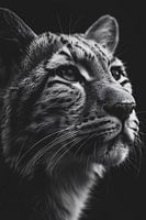 Dit krachtige zwart-witontwerp toont een close-up van een luipaard. De intensiteit in de ogen van het dier en de fijne details van zijn vacht en snorharen komen prachtig naar voren tegen de donkere achtergrond. De keuze voor zwart-wit versterkt de dramatische uitstraling en legt de nadruk op de textuur en contrasten in de afbeelding. Dit kunstwerk zou een indrukwekkende toevoeging zijn aan elk modern interieur, perfect voor liefhebbers van natuur en wildlife fotografie.