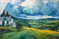 Zachte heuvels strekken zich uit onder een hemel vol wervelende wolken. Aan de rand van het landschap staat een pittoresk huis met een blauwe deur.