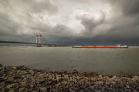 De zon komt met moeite door de lucht vol dreigende donkere wolken boven de majestueuze rivier de Waal bij de imposante Prins Willem Alexanderbrug in Echteld. Onder deze dreigende hemel vaart een schip richting de brug.