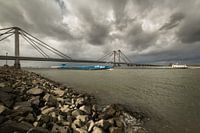 De zon komt met moeite door de lucht vol dreigende donkere wolken boven de majestueuze rivier de Waal bij de imposante Prins Willem Alexanderbrug in Echteld. Onder deze dreigende hemel varen twee schepen onder de brug door.