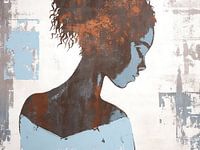 Industrial Look | Urban Serenity - Dit vrouwen schilderij toont een zijaanzicht van een vrouw met een expressief, roestbruin kroeshaar en een serene uitdrukking, uitgevoerd in een urban industrial stijl met ruwe, verweerde blauwe en grijze achtergrond.