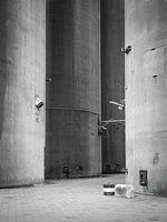 Een beeld met herhalende industriele betonnen silos