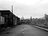 Zwart wit foto van een industrie gebied in Brooklyn, New York.