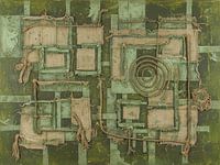 De compositie heeft een dubbele structuureffect: een geschilderd, geometrisch raster op de achtergrond en daarbovenop gestikte en gelijmde fragmenten van jute en touw die vierkante vormen en een spiraal creëren.