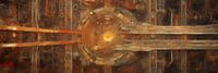 Dit werk toont het industriële hart van een futuristische faciliteit, een centraal mechanisme waaruit stralen van energie uitbarsten. De warme oranje en roodbruine kleuren geven een gevoel van intense warmte en activiteit, terwijl de geometrische patronen en symmetrische lijnen een gestructureerde, machineachtige precisie suggereren. De…