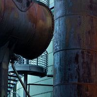 Dikke stalen buizen in een industrieel gebied, met een prachtig zachte blauwe achtergrond die het stoere met liefelijk verenigd.