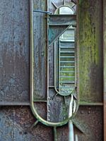 een doorkijkje door stalen verstevigingsschotten aan de wand van een verlaten fabriek. De fabriek is UNESCO werelderfgoed -industrieel erfgoed. de erosie en het verweerde materiaal geeft een mooi pastelkleurig kleurenpallet.