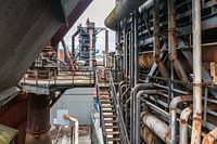 Industrieel landschap in het landschapspark Duisburg, in Duitsland. Doorkijkje naar hoogoven nummer vier vanaf hoogoven nummer vijf op het terrein van de voormalige ThyssenKrupp hoogovens gelegen in het Ruhrgebied (Ruhrpott) bij Duisburg-Nord. Deze foto is gemaakt in 2019.