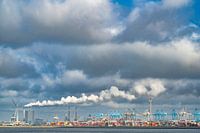 Industrieel landschap in de haven van Rotterdam met een zeecontainerterminal en een energiecentrale met wolken erboven.